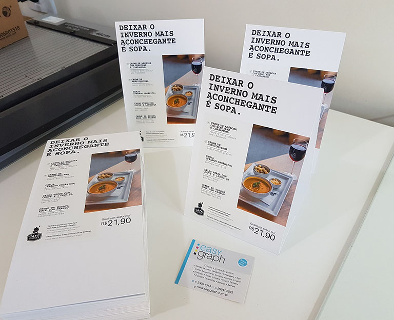 Displays informativos para identificação de mesas, lançamento de produtos e promoções. Produzidos em Papel triplex 300g, uma solução rápida e barata para veicular a sua marca.