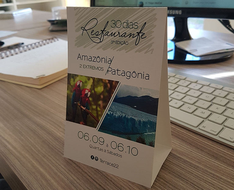 Displays informativos para identificação de mesas, lançamento de produtos e promoções. Produzidos em Papel triplex 300g, uma solução rápida e barata para veicular a sua marca.